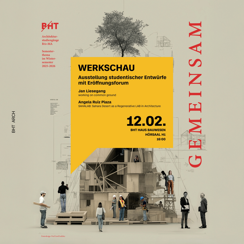 Die Ergebnisse werden am 12. Februar 2026 in einer großen Werkschau im Foyer des Hauses Bauwesen präsentiert. Ergänzt wird die Ausstellung durch spannende Impulsvorträge von Jan Liesegang und Angela Ruiz Plaza.